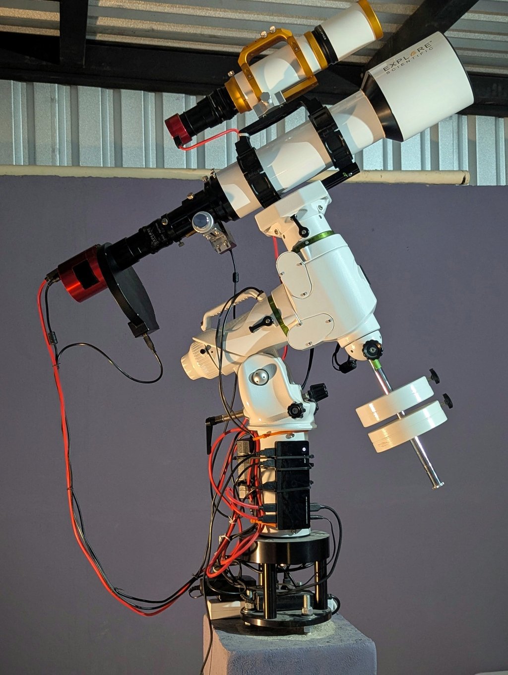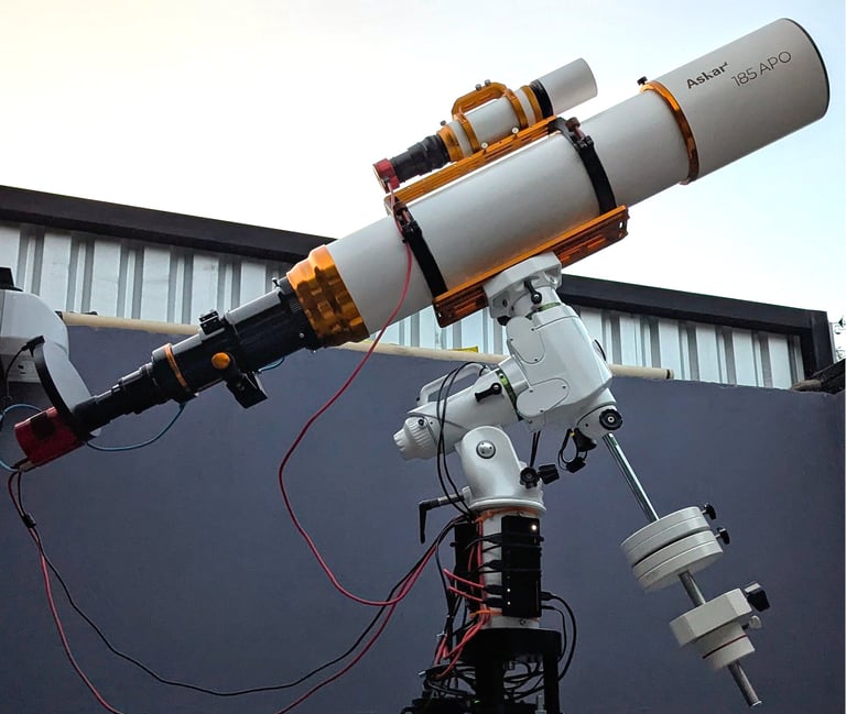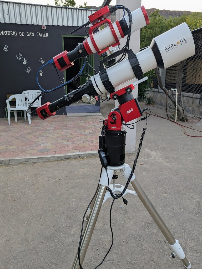 Nuestro telescopio principal es un refractor triplete APO Explore Scientific ED102mm, con una distancia focal de 714 mm y una relación focal de f/7. El telescopio guía es un Guidestar 61 APO F5.9 de 360 mm.