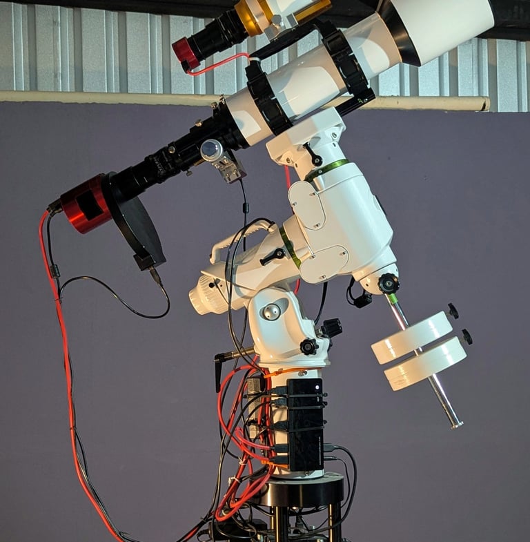 El telescopio principal se controla por computadora con NINA, PHD2 y SynScan Pro. Se utiliza SharpCap Pro para el apilamiento en vivo. Usamos Stellarium para nuestro planetario en una pantalla de gran formato y PixInsight, Siril y GIMP para el procesamiento de imágenes finales.