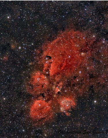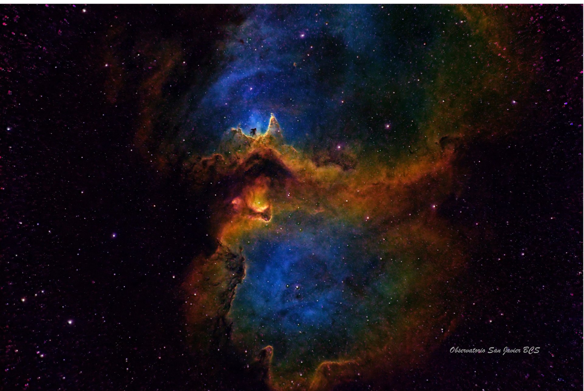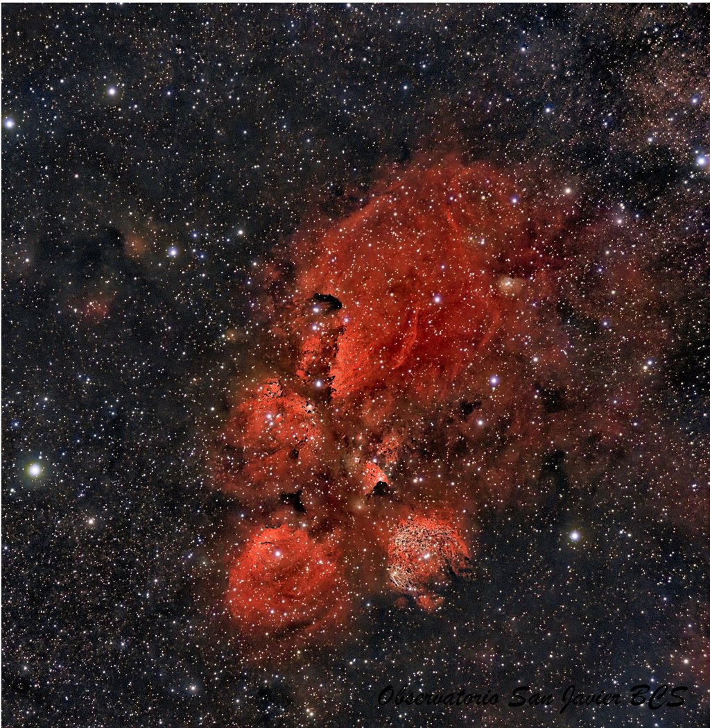 NGC 7380, Nebulosa del Mago. La Nebulosa del Mago es una nebulosa de emisión ubicada en la constelación de Cefeo. El objeto se encuentra a unos 7200 años luz de la Tierra y su forma le da nombre, ya que se asemeja a un mago. Este objeto presenta un cúmulo estelar abierto, que incluye una región activa de formación estelar compuesta por jóvenes estrellas azules y calientes dentro de la Vía Láctea. El intenso calor de la radiación de formación estelar crea vientos estelares que le dan forma.