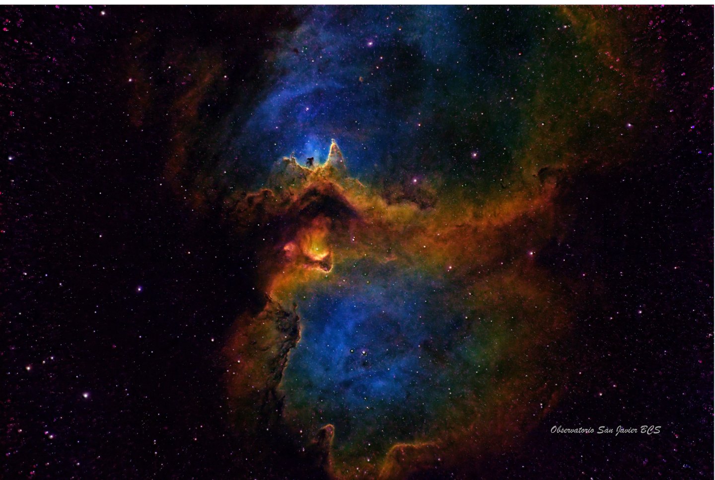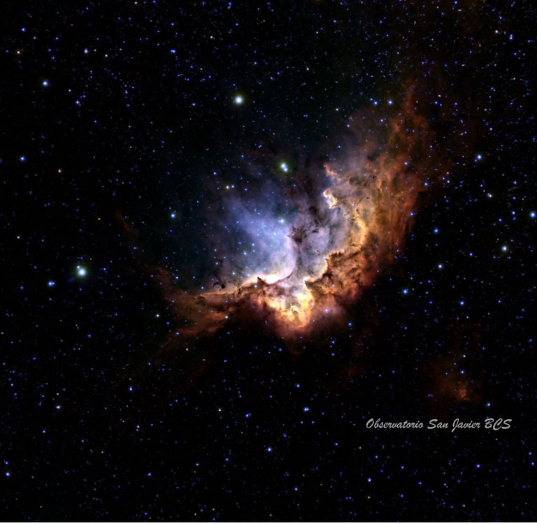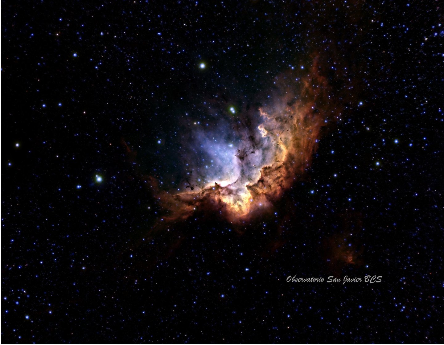 La Nebulosa Omega, M17, se encuentra en una zona de la constelación de Sagitario conocida por ser una de las regiones más ricas en formación estelar. La imagen incluye el cúmulo abierto NGC 6618, compuesto por nuevas estrellas calientes cuya radiación hace brillar la nebulosa.