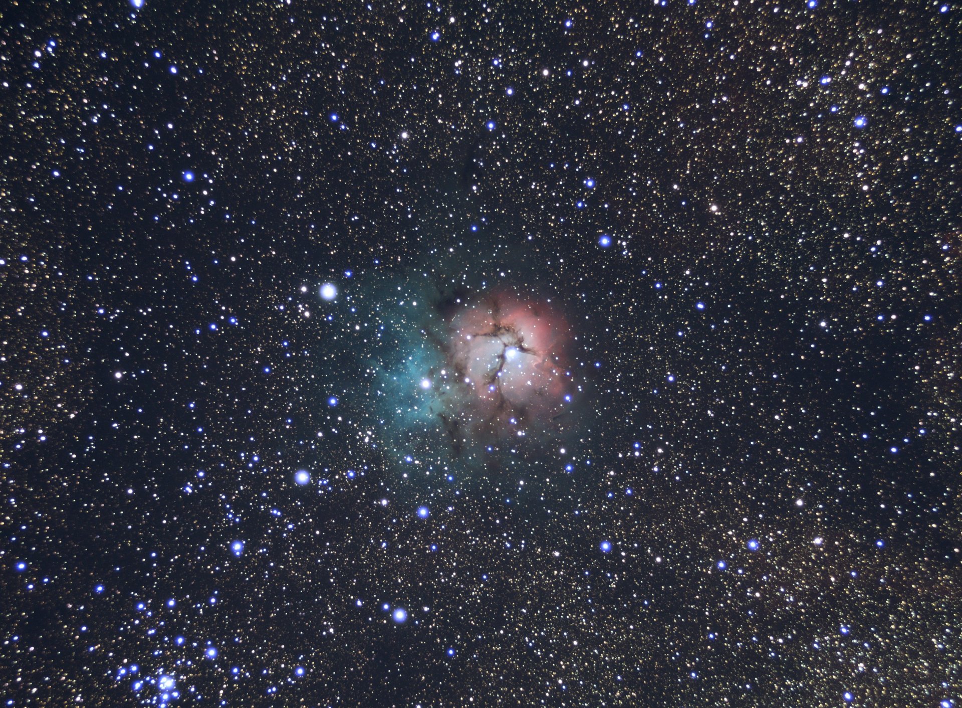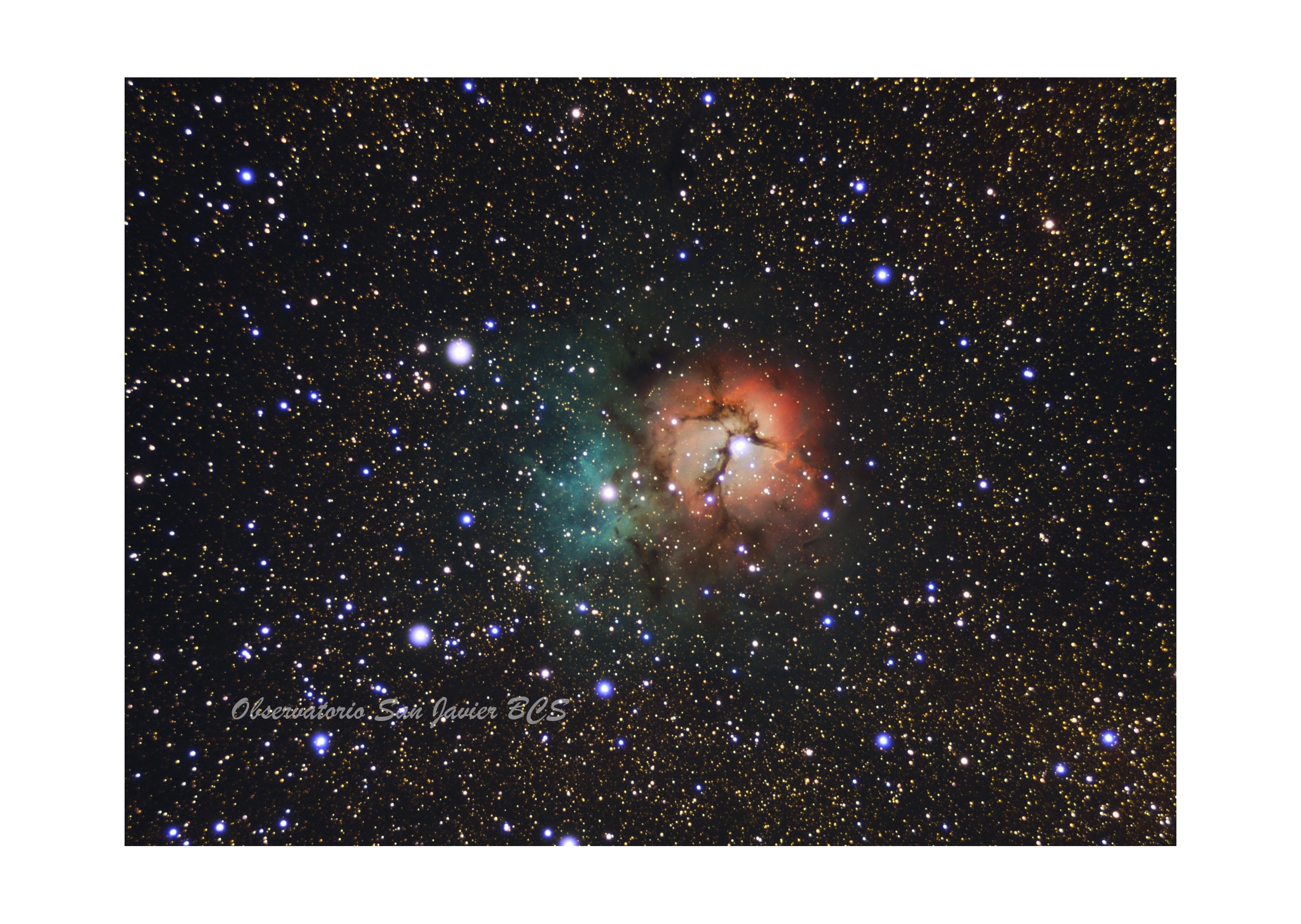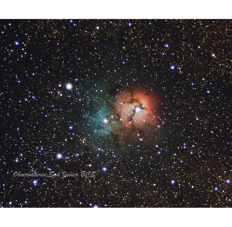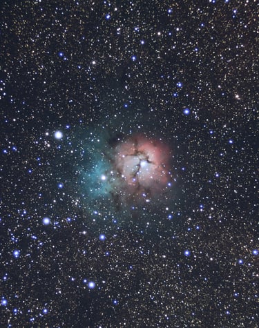 M20 es una nebulosa de formación estelar a unos 9.000 años luz de la Tierra, ubicada en la constelación de Sagitario. También se la conoce como la Nebulosa Trífida. La Nebulosa Trífida consta de dos tipos de nebulosa: la rosa es una nebulosa de emisión y la azul es una nebulosa de reflexión. Las líneas oscuras dentro del objeto son bandas de polvo que lo dividen en tres componentes principales, de ahí su nombre.