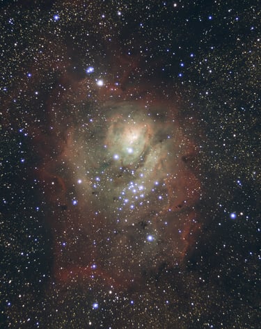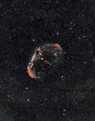 SH2-132, la Nebulosa del León, es una vasta y débil nebulosa de emisión en la constelación de Cefeo, a unos 10.000 años luz de distancia, conocida por su brillante gas de hidrógeno y oxígeno, sus intrincadas estructuras y su activa formación estelar, energizada por estrellas Wolf-Rayet masivas, lo que la convierte en un objetivo desafiante pero gratificante para los astrofotógrafos que buscan imágenes detalladas de guarderías estelares.