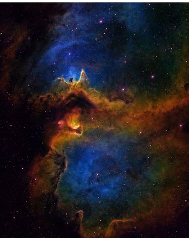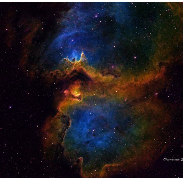 IC 1805, la nebulosa del corazón es una nebulosa de emisión en la constelación de Cassiopeia. La zona brillante en el centro de la imagen es un cúmulo abierto de estrellas calientes que emiten radiación, la cual define la morfología del objeto. La nebulosa también está compuesta de gases de oxígeno y azufre ionizados, que son los responsables de los colores azul y naranja que se ven en esta imagen de banda estrecha SHO.