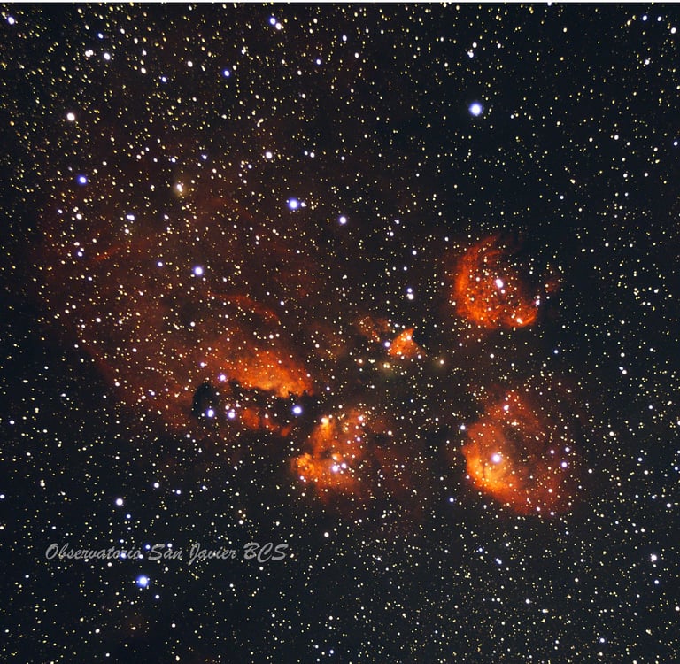 La Nebulosa del Alma, IC 1848, también conocida como Westerhout 5, es una nebulosa de emisión en la constelación de Casiopea. Se encuentra a unos 6.500 años luz de la Tierra y es un complejo de formación estelar. Como se ve aquí, el objeto contiene grandes cavidades excavadas por la radiación y los vientos de las estrellas más masivas de la región. Estos vientos provocan la unión de los gases y la formación de nuevas estrellas. Esta nebulosa se encuentra cerca de un objeto similar, también formado por cavidades, conocido como la Nebulosa del Corazón. Juntas, ambas forman las nebulosas del Corazón y del Alma.