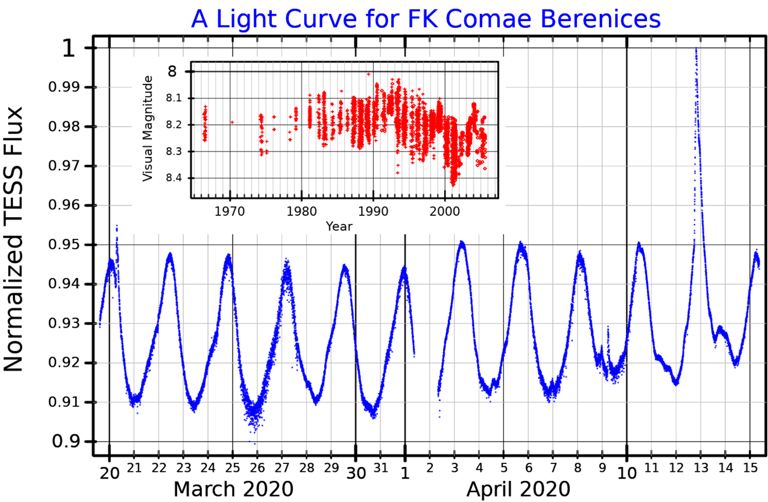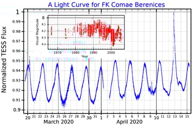 Main plot: light curve for FK Comae Berenices, plotted from TESS satellite data, Inset: a light curve showing the long term variability adapted from Panov and Dimitrov, A&A 467, 229–235 (2007)
