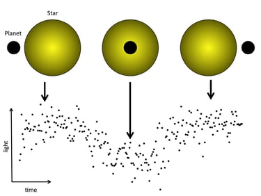 TESS registra cómo varía el brillo de las estrellas individuales a lo largo del tiempo. Esta serie temporal de mediciones de brillo se conoce como curva de luz. Cuando un exoplaneta pasa, o transita, frente a su estrella anfitriona, esta se atenúa momentáneamente y observamos una disminución en su curva de luz. Este método de detección de planetas se conoce como el Método de Tránsito y ya ha demostrado ser extremadamente eficaz.