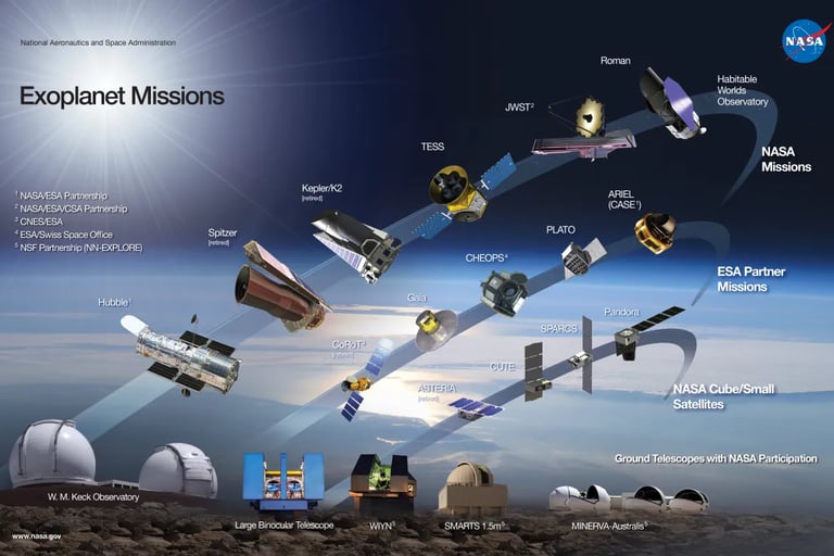 Numerosos telescopios contribuyen a la búsqueda y el estudio de exoplanetas, incluyendo algunos en el espacio (conceptos artísticos mostrados aquí) y en la Tierra. Organizaciones de todo el mundo, como la ESA (Agencia Espacial Europea), la CSA (Agencia Espacial Canadiense) y la NSF (Fundación Nacional para la Ciencia), realizan esta labor.