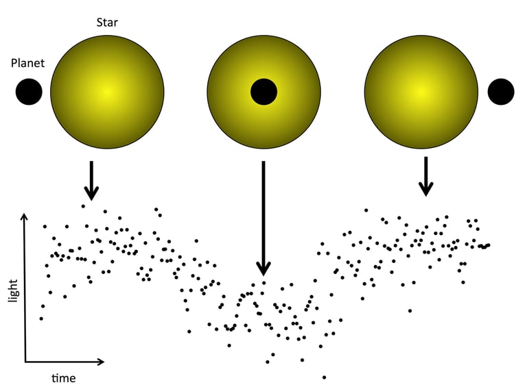 Método de tránsito: este método detecta la ligera atenuación periódica de la luz de una estrella cuando un planeta pasa frente a ella desde nuestra perspectiva.