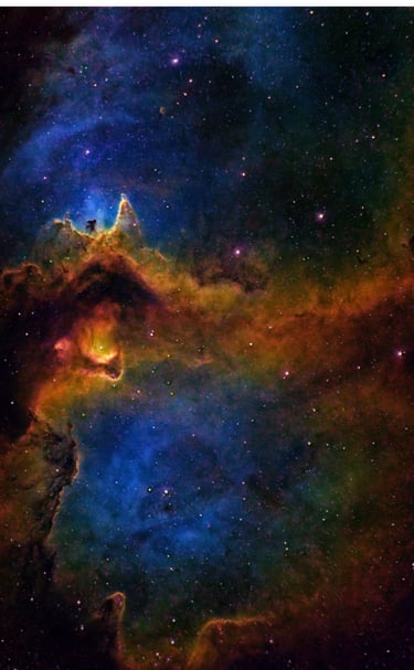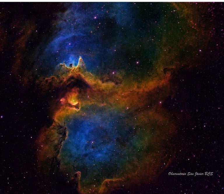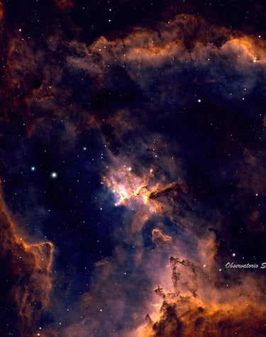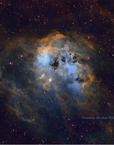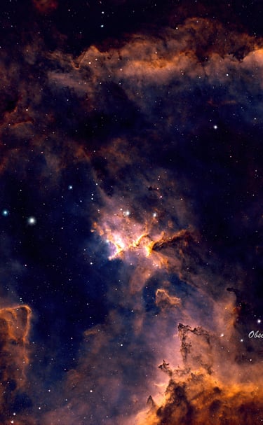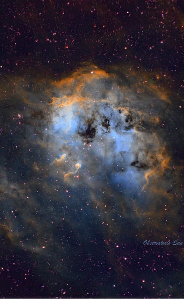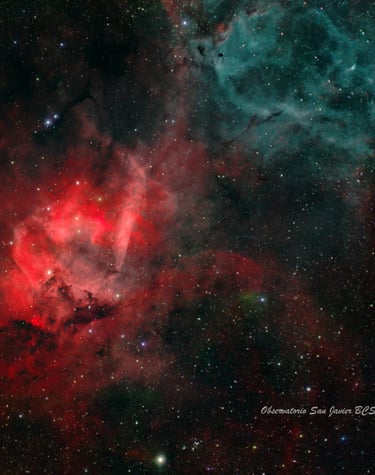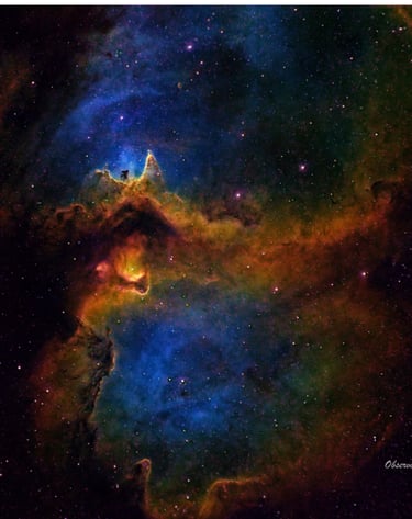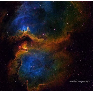 IC 1805, la nebulosa del corazón es una nebulosa de emisión en la constelación de Cassiopeia. La zona brillante en el centro de la imagen es un cúmulo abierto de estrellas calientes que emiten radiación, la cual define la morfología del objeto. La nebulosa también está compuesta de gases de oxígeno y azufre ionizados, que son los responsables de los colores azul y naranja que se ven en esta imagen de banda estrecha SHO.