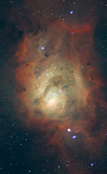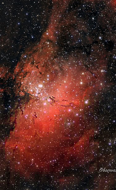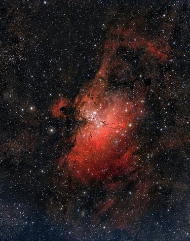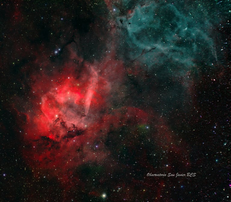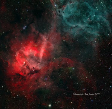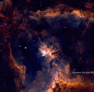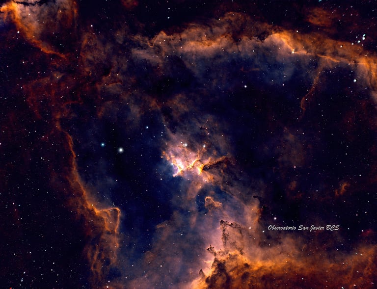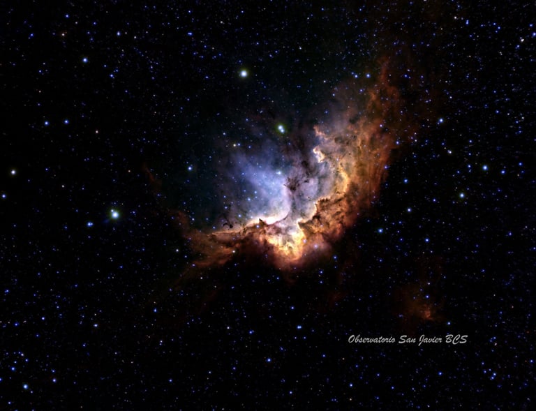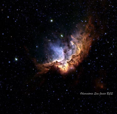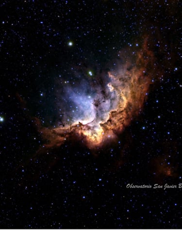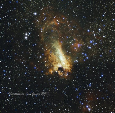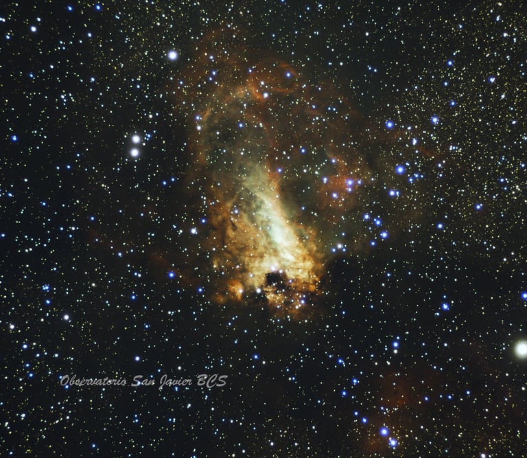 La Nebulosa Omega, M17, se encuentra en una zona de la constelación de Sagitario conocida por ser una de las regiones más ricas en formación estelar. La imagen incluye el cúmulo abierto NGC 6618, compuesto por nuevas estrellas calientes cuya radiación hace brillar la nebulosa.