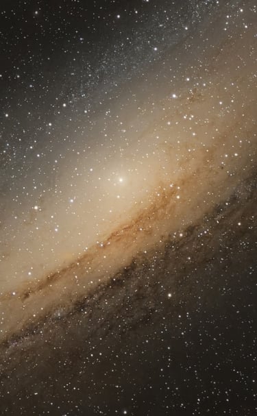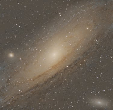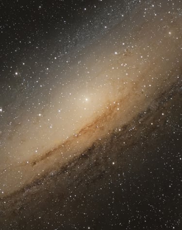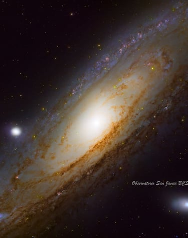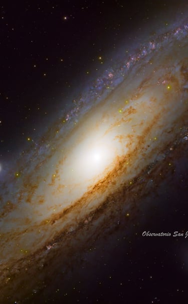 Esta es la galaxia de Andrómeda, M31, fotografiada en banda estrecha SHO. Andrómeda es conocida por ser la galaxia más grande cercana a nuestra Vía Láctea. A pesar de estar situada más cerca de la Vía Láctea, todavía está a 2,5 millones de años luz de distancia, lo que significa que su nave espacial viajando a la velocidad de la luz (300.000 km/seg) tardaría dos millones y medio de años en llegar a las proximidades de la Galaxia de Andrómeda. Los otros miles de millones de galaxias que existen en el universo están mucho más lejos que eso.
