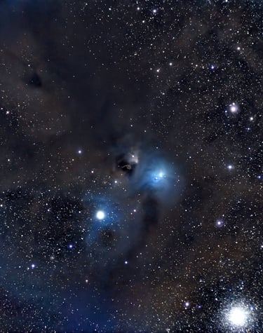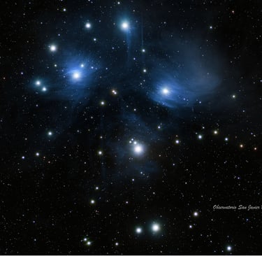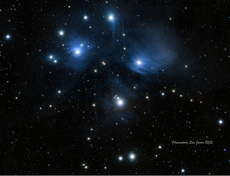 M45, Las Pléyades, también conocidas como las «Siete Hermanas», son un cúmulo estelar abierto en la constelación de Tauro. Está compuesto por más de 1000 estrellas y se encuentra a unos 444 años luz de la Tierra. El brillo azul de la nebulosa de reflexión se debe a la dispersión de las longitudes de onda de la luz azul por una nube de polvo.