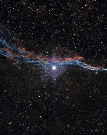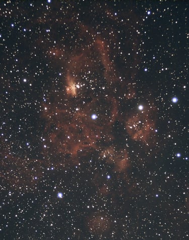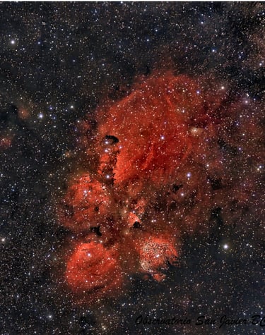 SH2-132, la Nebulosa del León, es una vasta y débil nebulosa de emisión en la constelación de Cefeo, a unos 10.000 años luz de distancia, conocida por su brillante gas de hidrógeno y oxígeno, sus intrincadas estructuras y su activa formación estelar, energizada por estrellas Wolf-Rayet masivas, lo que la convierte en un objetivo desafiante pero gratificante para los astrofotógrafos que buscan imágenes detalladas de guarderías estelares.