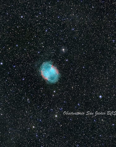 La Nebulosa Mancuerna, M27, es una nebulosa planetaria. Está formada por la nebulosidad que rodea a una enana blanca y se encuentra en la constelación de Vulpecula, a unos 1360 años luz de la Tierra. La principal diferencia entre una nebulosa planetaria y una nebulosa galáctica es que la nebulosa planetaria es una capa de gas brillante emitida por una estrella moribunda, mientras que una nebulosa galáctica es una nube mucho más grande de gas y polvo que puede existir en toda una galaxia.