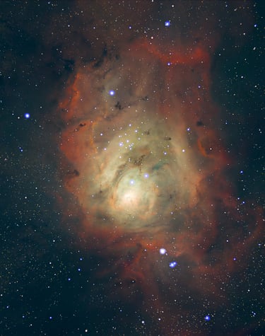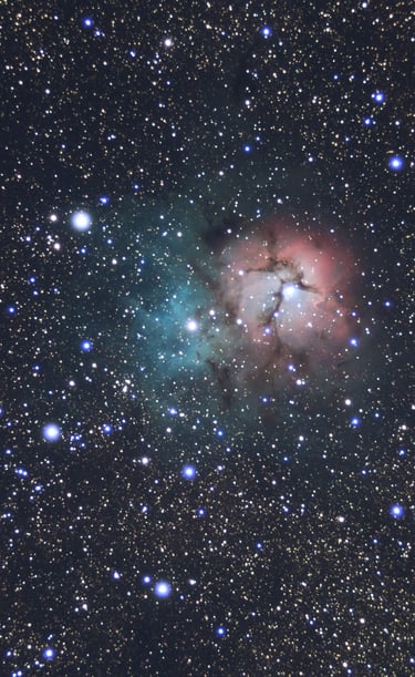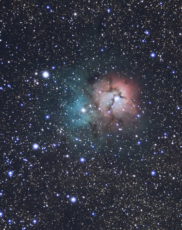 M20 es una nebulosa de formación estelar a unos 9.000 años luz de la Tierra, ubicada en la constelación de Sagitario. También se la conoce como la Nebulosa Trífida. La Nebulosa Trífida consta de dos tipos de nebulosa: la rosa es una nebulosa de emisión y la azul es una nebulosa de reflexión. Las líneas oscuras dentro del objeto son bandas de polvo que lo dividen en tres componentes principales, de ahí su nombre.