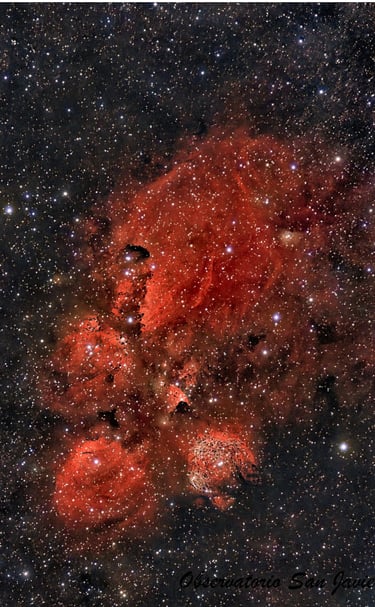 La Nebulosa del Alma, IC 1848, también conocida como Westerhout 5, es una nebulosa de emisión en la constelación de Casiopea. Se encuentra a unos 6.500 años luz de la Tierra y es un complejo de formación estelar. Como se ve aquí, el objeto contiene grandes cavidades excavadas por la radiación y los vientos de las estrellas más masivas de la región. Estos vientos provocan la unión de los gases y la formación de nuevas estrellas. Esta nebulosa se encuentra cerca de un objeto similar, también formado por cavidades, conocido como la Nebulosa del Corazón. Juntas, ambas forman las nebulosas del Corazón y del Alma.
