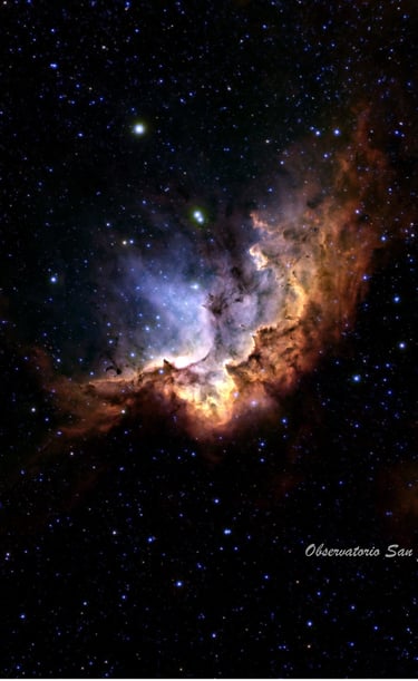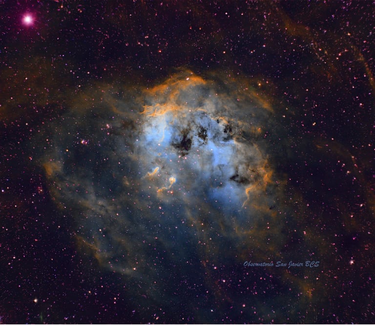 NGC 7380, Nebulosa del Mago. La Nebulosa del Mago es una nebulosa de emisión ubicada en la constelación de Cefeo. El objeto se encuentra a unos 7200 años luz de la Tierra y su forma le da nombre, ya que se asemeja a un mago. Este objeto presenta un cúmulo estelar abierto, que incluye una región activa de formación estelar compuesta por jóvenes estrellas azules y calientes dentro de la Vía Láctea. El intenso calor de la radiación de formación estelar crea vientos estelares que le dan forma.