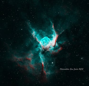 NGC 2359, el Casco de Thor, es una nebulosa de emisión a unos 12.000 años luz de distancia. La estrella central es Wolf-Rayet WR7, una estrella extremadamente caliente, que probablemente se encuentra en una etapa de evolución presupernova.
