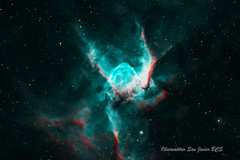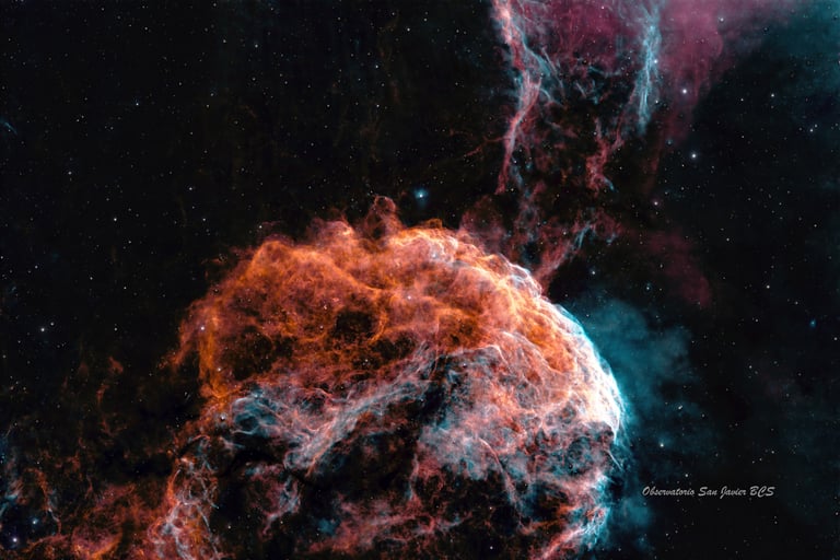 La Nebulosa de la Medusa (IC 443) es un vibrante remanente de supernova ubicado aproximadamente a 5.000 años luz de la Tierra, en la constelación de Géminis. Representa los restos gaseosos de una estrella masiva que explotó hace aproximadamente 30.000 años. Es conocida por sus distintivos filamentos con forma de tentáculo y su brillante forma de cabeza bulbosa.