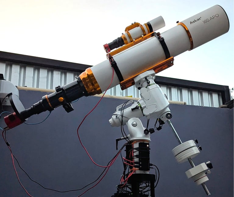 El nuevo telescopio está configurado actualmente con un aplanador 1x1, un autoenfoque Pegasus Cube3, una rueda de filtros ZWO 7 y una cámara ZWO ASI2600MM Pro.